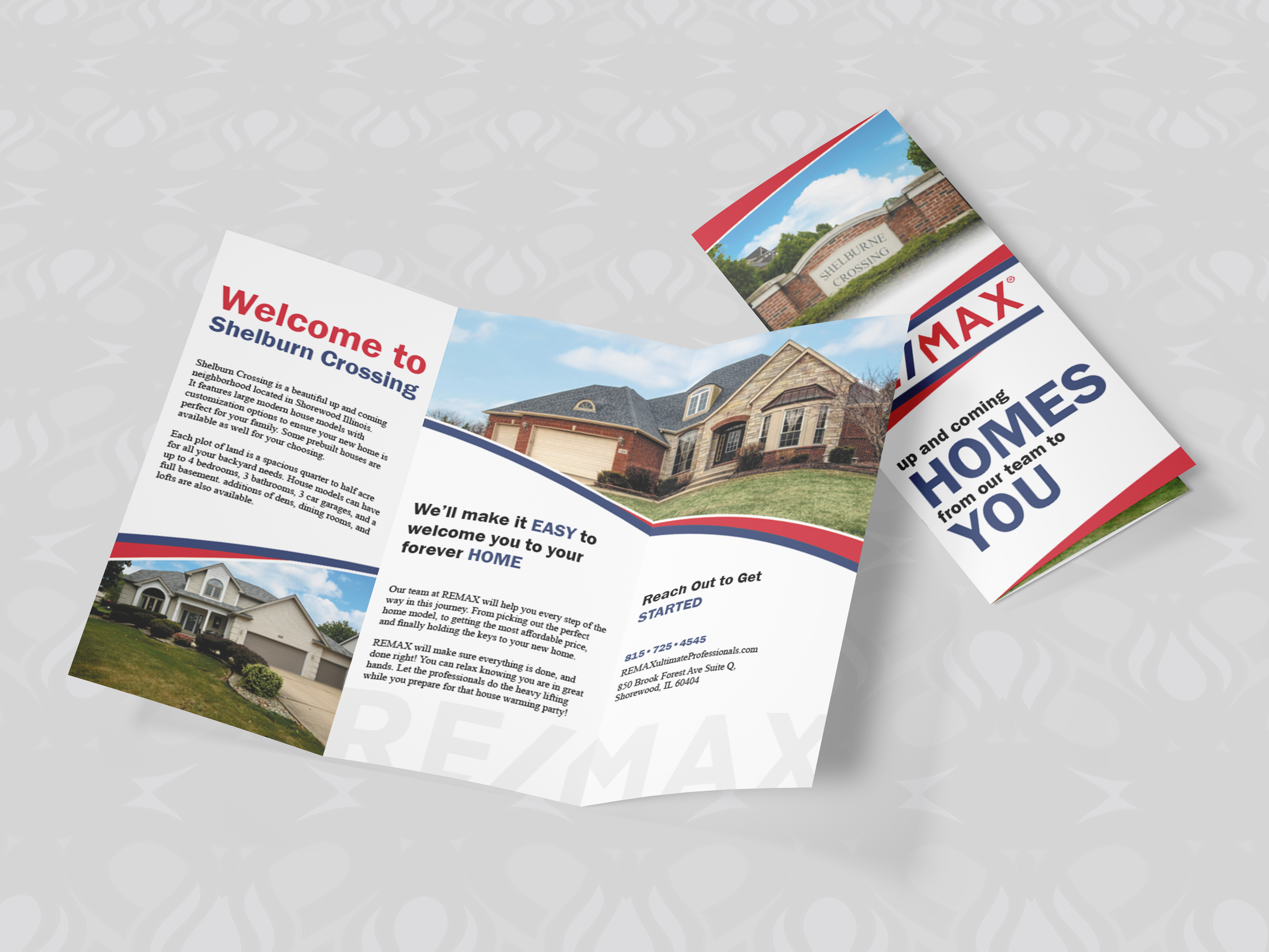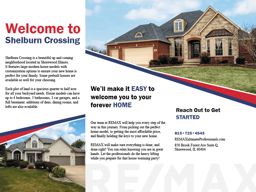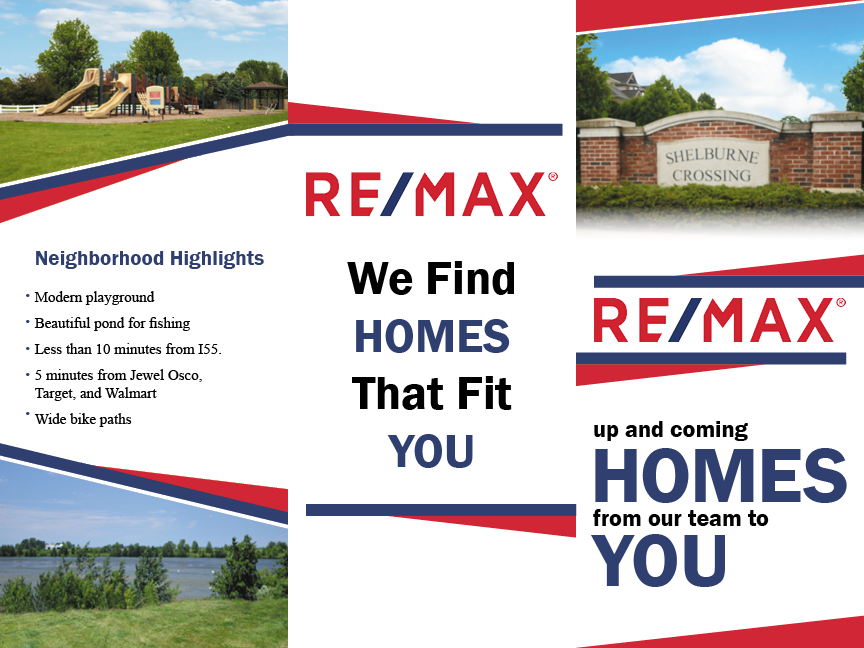 My client wanted me to create a brochure advertising the new neighborhood being built in their town. They wanted me to feature a few of the model homes as well as a couple neighborhood ammenities. They asked for this to be eye catching with their bold colors in a fun and modern way.